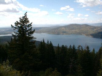 Tuesday May 23, 2000 - Whitefish Lake We had breakfast at the motel and then went to the Chamber of Commerce for maps. We then drove up to Whitefish, which is just a little north of Kalispell, and drove up to Big Mountain ski area. The road was steep with hairpin curves and no guardrail. There are great views of Whitefish Lake on the way up. We were impressed with a beautiful log house being built overlooking Whitefish Lake.