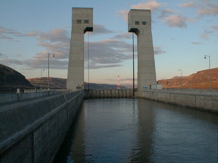 Looking back downstream through John Day Lock. This lock has the world's highest single lift gate, 113 feet. You can just make out Mount Hood in the distance to the right of the transmission tower.