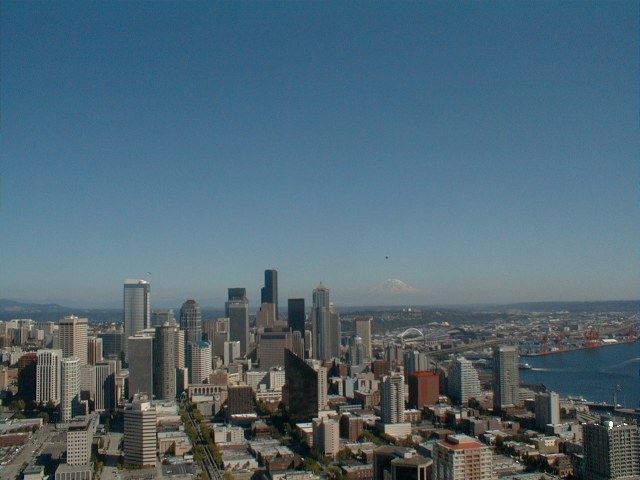 A view of Seattle and Mt. Rainier from the Space Needle, with the Goodyear Blimp overhead