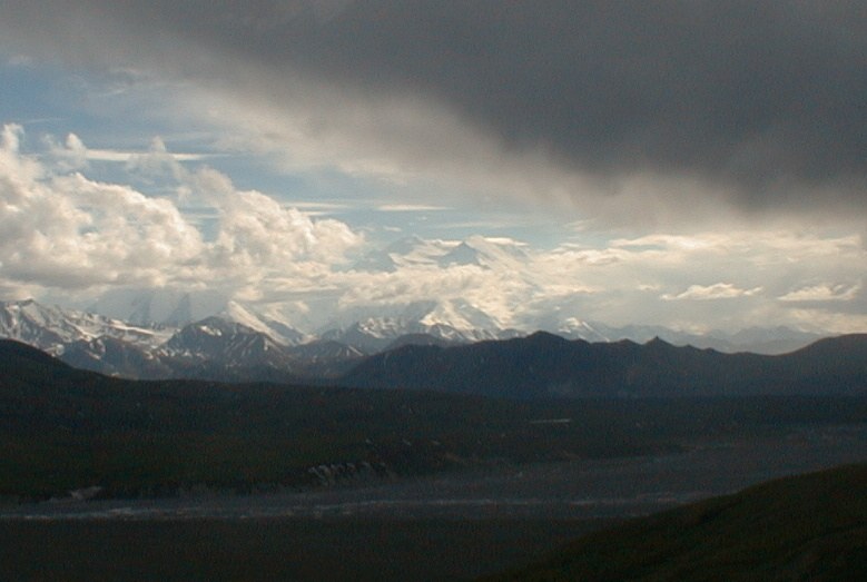 A rare view of Mt. McKinley's North and South Peaks breaking out of the clouds