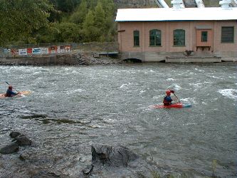 Friday May 26 - Bigfork After breakfast (huckleberry syrup on French toast) in the Izaac Walton Dining Room, we drove back along the Middle Fork as far as Columbia Falls, and then took Hwy 2 and 206 and 35 to the town of Bigfork on Flathead Lake. There we got off the bus and spent about an hour walking around the small shop area. There are a lot of stores selling artwork, mostly Western art (Indians and cowboys). Bigfork was hosting a whitewater festival, so we watched kayakers running a slalom course on the Swan River which runs into Flathead Lake. After our brief tour of Bigfork, we got back on the bus to travel to Paradise to catch the train east across Montana. We drove around the north shore of Flathead Lake, past the Eagle's Bend Golf Course and stopped for lunch at the Montana Grill, where we had buffalo burgers.